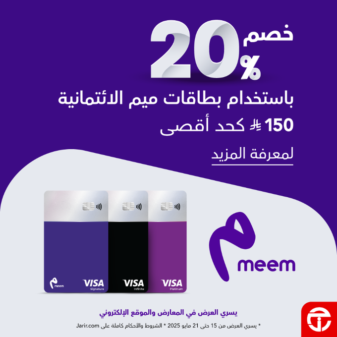 استمتع بخصم إضافي 20% عند تسوّقك في معارض جرير أو موقع جرير الإلكتروني باستخدام بطاقات ميم الائتمانية