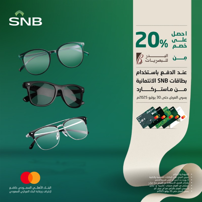 استمتع بخصم 20% من ” البدر للبصريات” باستخدام بطاقات البنك الأهلي السعودي الائتمانية من ماستركارد!