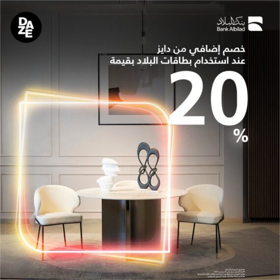 فرصتك الآن لشراء أثاث بيتك أو شقتك أو في حال رغبت في تجديد أثاث منزلك استمتع بخصم 20% مع بطاقات البلاد ودايز للأثاث عند الدفع ببطاقات بنك البلاد الائتمانية أو بطاقة مدى!
