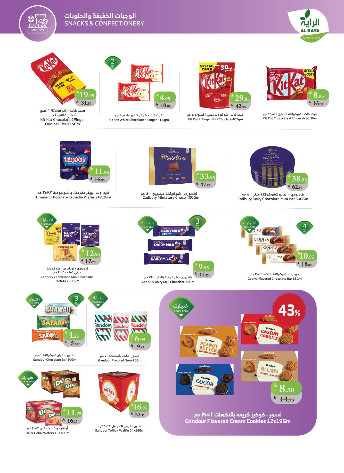 اغتنموا العروض الأسبوعية المميزة و استمتعوا بالتسوق في أسواق الراية، حيث تحرص الراية دائما على تقديم مجموعة واسعة من المنتجات التي تشمل الأغذية الطازجة والمواد المنزلية المختارة لتلبية احتياجات العملاء اليومية، مع التركيز على توفير أفضل الأسعار وأعلى جودة ممكنة. فمن خلال تصميم السوق العصري وتنظيم الأقسام بشكل يسهل التنقل بينها، يصبح التسوق متعة بحد ذاته.